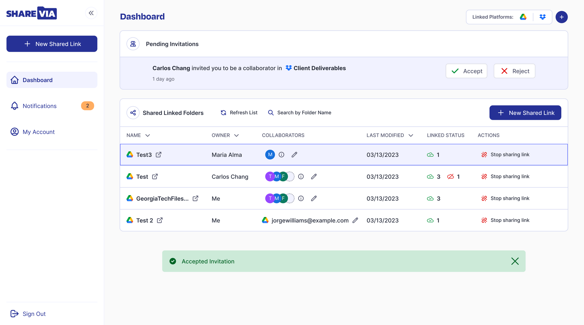 ShareVia connects folders across different cloud platforms, automatically syncing access for clients, vendors, and contractors.